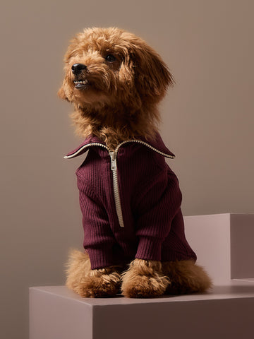 A cozy burgundy knit turtleneck designed for effortless style and comfort. The soft ribbed fabric provides a snug fit, and the short neck zipper makes it easy to put on.