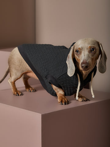 Black hooded vest. Textured, lightweight, and stylish - perfect for walks and everyday wear.