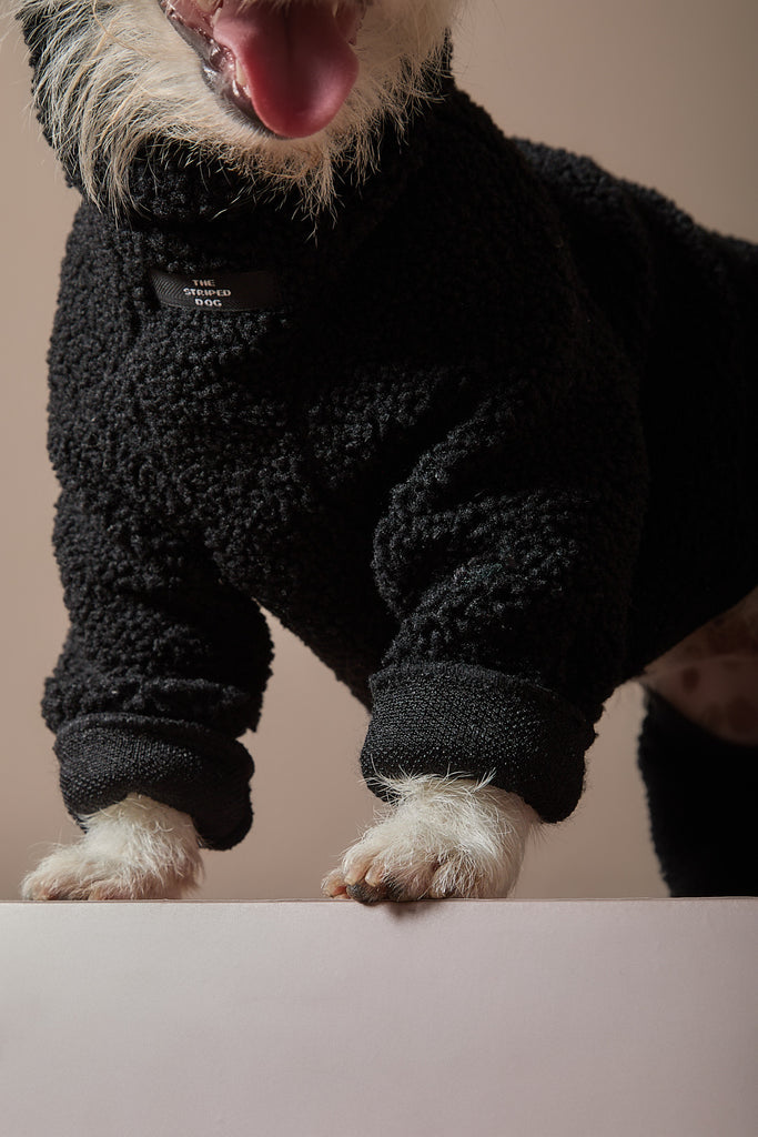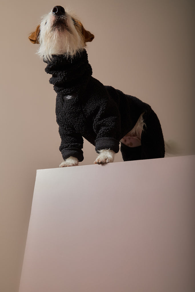 Cozy turtleneck jumpsuit in stretchy sherpa and ribbed details.