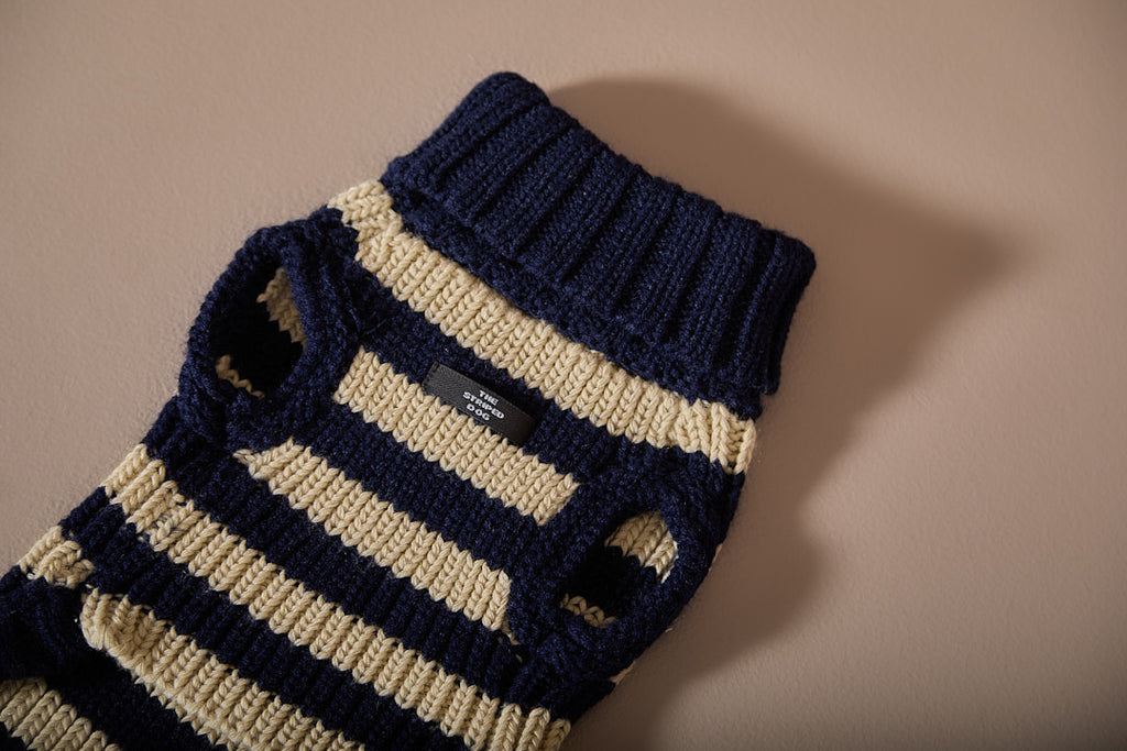 Cozy navy and sand striped knit turtleneck sweater designed to keep your dog warm and stylish.