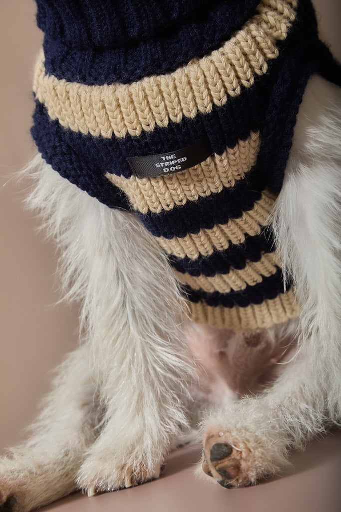 Cozy navy and sand striped knit turtleneck sweater designed to keep your dog warm and stylish.